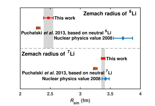 精密测量院研究员高克林领导的囚禁离子物理研究组、研究员史庭云领导的原子分子外场理论研究组,加拿大新不伦瑞克大学教授严宗朝和加拿大温莎大学教授G. W. F. Drake合作开展类氦锂离子精密谱研究逾十年,近期在锂离子精密谱研究中取得了重要进展,精确确定了锂原子核的电磁分布半径(Zemach半径)。相关研究发表在物理学权威期刊Phys. Rev. Lett和Phys. Rev. A上。