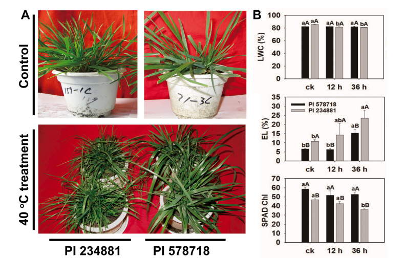 图1. 极端耐热(PI 578718)和不耐热高羊茅(PI 234881)抗高温表型