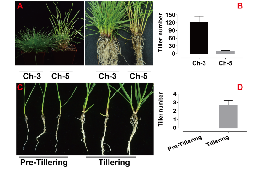 进展二:以学科组鉴定的高分蘖数‘Ch-3’和低分蘖数‘Ch-5’为材料,并选取猎狗五V号高羊茅分蘖前、后组织作为对照,进行全基因组small RNA测序分析。共获得22200万的clean data。鉴定到208个miRNAs,其中148个为known miRNAs,60个为 novel miRNAs。208个miRNAs 共靶标28927个基因。进一步研究发现,18个miRNAs与高羊茅分蘖数相关联。除去osa-miR156a, zma-miR528a-3p,osa-miR444b.2三个miRNA,其余15个miRNAs是植物中首次鉴定与分蘖数相关的miRNA。这18个miRNAs 共靶标212个基因,涉及到“ubiquitinmediated proteolysis”,“phagosome”,“fatty acid biosynthesis”, “oxidative phosphorylation”和“biosynthesis of unsaturated fatty acids” KEGG 途径。另外,bdi-miR167e-3p靶标两个磷酸化激酶蛋白 EIF2AK4和IRAK4。osa-miR397a 靶标生长素应答因子ARF5。这些新获得miRNAs(已上传至GenBank,登记号:SRR11640118, SRR11640119, SRR11640120 和SRR11640121)将为高羊茅分蘖数调控机理研究和相关遗传改良提供资源。研究成果以“Genome-wide small RNA profiling reveals tiller development in tall fescue (Festuca arundinacea Schreb)”为题,发表于国际学术期刊BMC Genomics。武汉植物园草坪草与牧草分子育种学科组胡涛副研究员为论文第一作者,陈良研究员为论文通讯作者。研究得到国家自然科学基金、山东省重大科技创新工程、中科院科技扶贫专项等项目资助。