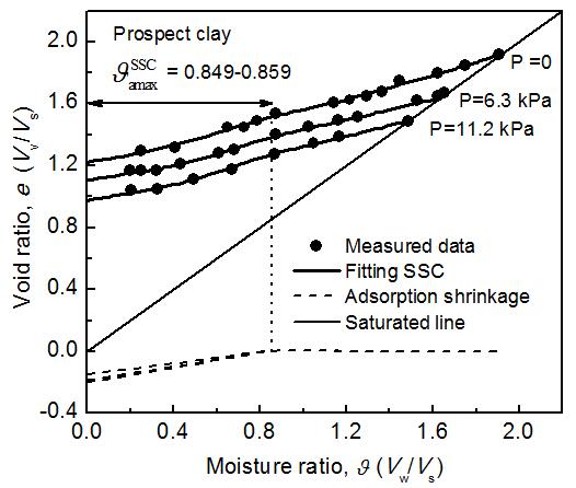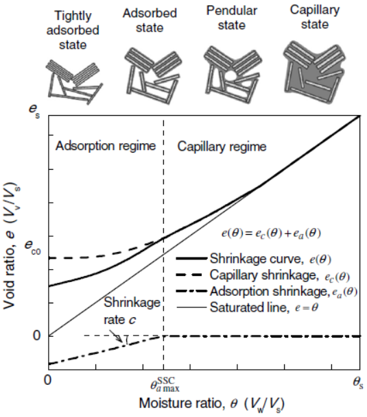 为解决以上问题,武汉岩土所韦昌富研究团队与美国科罗拉多矿业大学Lu Ning教授联合攻关,基于土体毛细和吸附水的水力特性与收缩变形力学响应的内在机制,将土体收缩变形概化为两部分:毛细收缩(毛细水变化控制)与吸附收缩(吸附水变化控制),其分界为最大吸附水含量。提出了一个全含水量变化范围的广义土体收缩曲线方程。通过与实测数据对比,验证了模型的适用性。通过进一步研究表明,吸附阶段的收缩率与土体的比表面积与离子交换量具有良好的相关性。证实了考虑吸附收缩对土体收缩特性影响重要性及合理性。