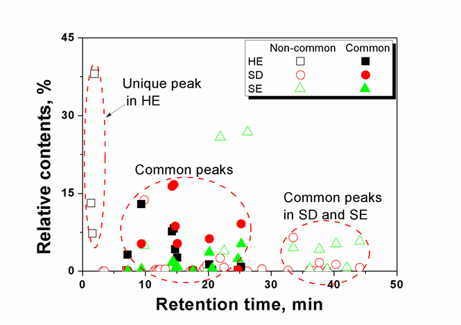 图1三种提取技术(HE、SD、SE)从莲花中提取挥发油的共有和特征性化学成分分析