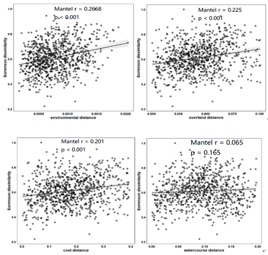 图1 底栖动物群落相异性与环境、直线、景观和水网距离的关系