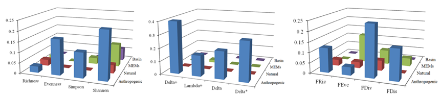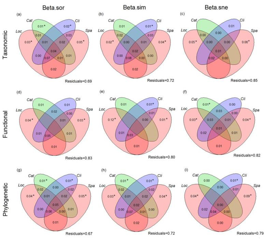 图2 物种、功能和系统发育beta多样性对局域、流域、区域环境因子和空间因子的响应