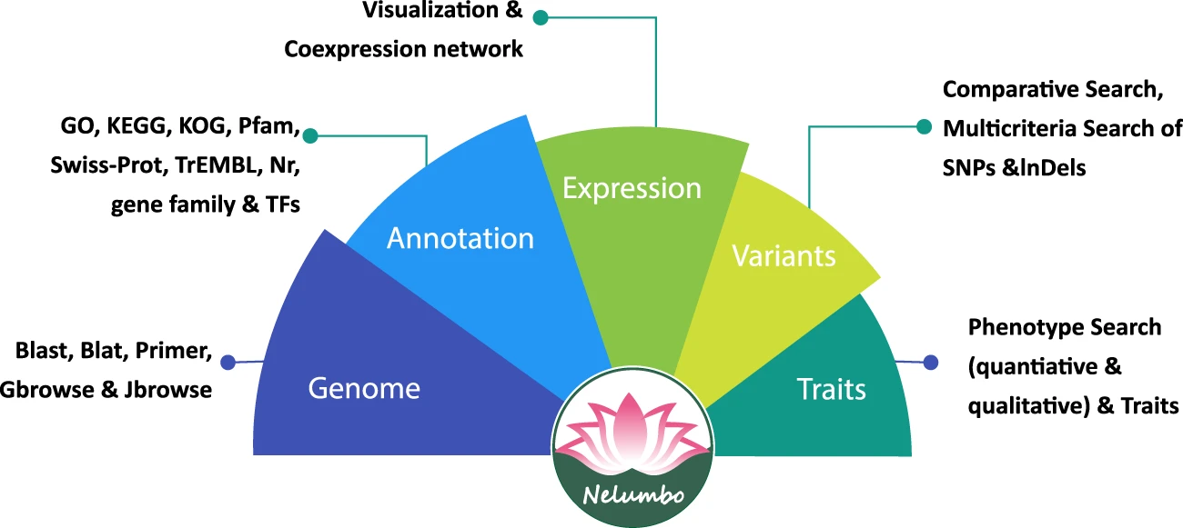 NGD部署了中国古代莲最新基于HI-C技术的染色体水平基因组组装序列,收录了注释到的150,589个mRNA转录本异构体和34,481 个具有完整开放阅读框的基因,为破解莲分子遗传机理提供“关键钥匙”。同时,该数据库整合了公共数据库中莲的11个组织不同时期的共63个转录组基因表达数据,并构建了加权基因共表达网络,涵盖了不同器官(组织)类型发育调控以及同一组织不同发育调控过程中的协同表达的基因模块(module),为了解莲的基因表达调控规律提供重要的公共分析平台。此外,该数据库对荷花中具有代表性的88个栽培种表型性状进行了数字化,并基于实验室内部以及先前发表的基因组重测序数据相应鉴定了26,939,834个高质量单核苷酸多态性变异位点和4,177,974个插入缺失变异位点,丰富了莲的遗传变异信息。该数据库部署了包含Blast、Gbrowse、Primer Design和Expression Visualization在内的多个生物信息学工具,使得莲的基因序列、功能及表达的相关信息更易获取,该公共数据平台为展开莲的基因组进化、分子遗传以及分子育种等领域的研究及实验设计提供了有价值的参考信息。