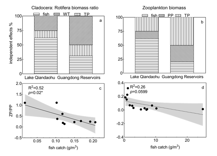 为了探究沿着温度梯度的(亚)热带水库中渔业养殖如何通过解耦营养级联效应来影响水质,研究人员首先比较分析了亚热带千岛湖(又名新安江水库)和热带广东省水库中浮游动物体长和生物量受到的上下行效应大小。结果表明,鱼捕食是影响千岛湖浮游动物体长和生物量的主要因子,称为鱼控制的水库;而水温和总磷分别是影响广东省水库浮游动物体长和生物量的主要因子,称为营养盐控制的水库(图1)。