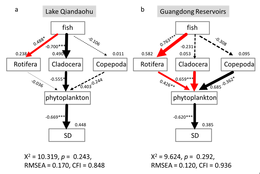 研究人员还建立了鱼-浮游动物-藻类食物链对水质影响的结构方程模型。结果表明,贫营养千岛湖(平均TN:1mg/L;TP:0.01mg/L)中高鱼捕食压力导致浮游动物的体长和生物量减小,减弱了对藻类的牧食压力,导致水体透明度下降;而富营养广东省水库(平均TN:1.6mg/L;TP:0.04mg/L)中鱼类捕食对浮游动物低效率地牧食藻类影响不显著(图2),表明广东省水库浮游动物虚弱地牧食藻类能力。在鱼控制的千岛湖,浮游动物体长变化作为水质指示因子的效果强于营养盐控制的广东省水库。