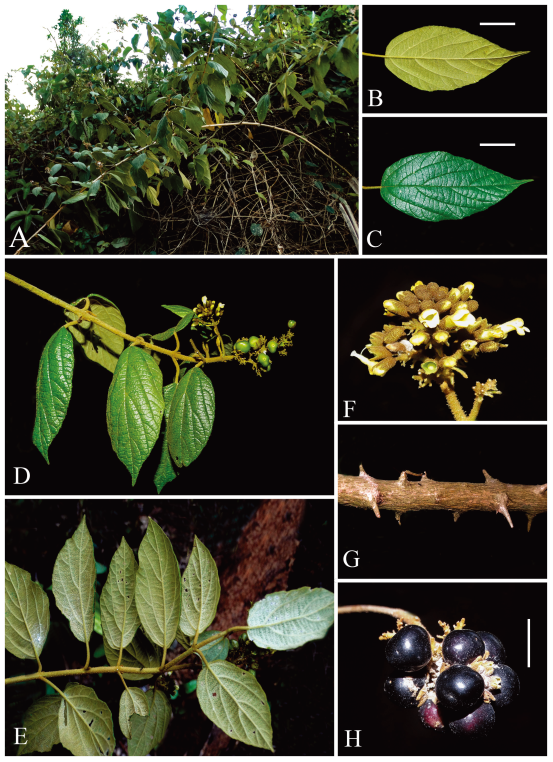 图1. Premna mwadimei sp. nov. A生境;B叶片远轴面;C叶片近轴面;D具花果的枝条;E显示叶在远轴面排列方式的枝条;F花序;G带刺的茎;H成熟的果实