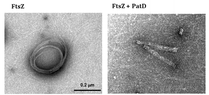 Fig. 2 PatD对FtsZ形成的聚合物形态的影响。通过TEM观察由纯化的FtsZ (5.6 μM) 与(右图)或不与 (左图) 纯化的 PatD (9 μM) 孵育形成的聚合物。 两张图片的放大倍数相同。(doi: 10.1111/1462-2920.15682.)