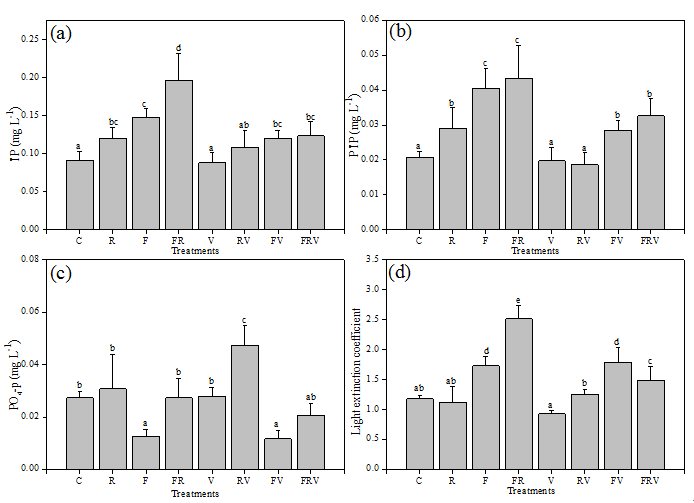 图2 总磷、颗粒性总磷、正磷酸盐和消光系数在不同处理中的差异性。小写字母表示S-N-多重比较的差异