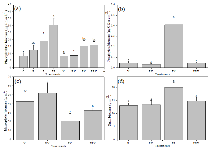 图3 浮游植物、附着藻、沉水植物和螺生物量在不同处理条件下的差异性。小写字母表示多重比较的差异