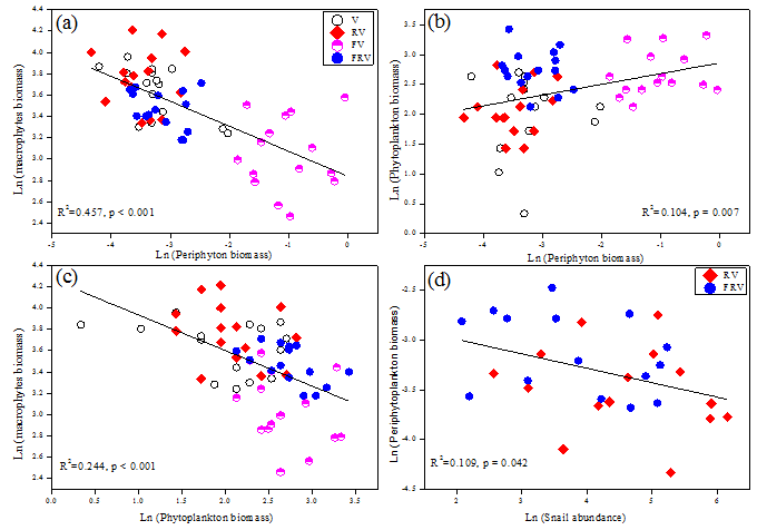 此外,底层鱼类显著性地促进浮游植物和附着藻生长,抑制了沉水植物生长(图3)。沉水植物与浮游植物的生物量,沉水植物与附着藻的生物量,附着藻生物量与螺丰度均存在显著性负相关(P < 0.05;图4)。