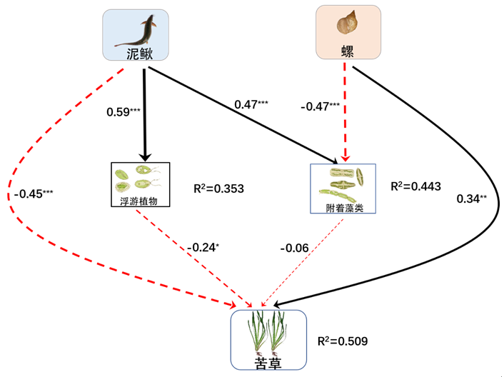 图5 底层鱼,螺,浮游植物和附着藻类对沉水植物的直接和间接影响。箭头旁边的数字是标准化的路径系数,其数值大小表示二者之间的相互作用强度。实心黑色箭头表示正相关关系,虚线红色箭头表示负相关关系。R2表示模型中每个因变量解释的方差比例