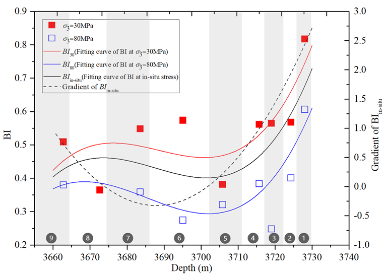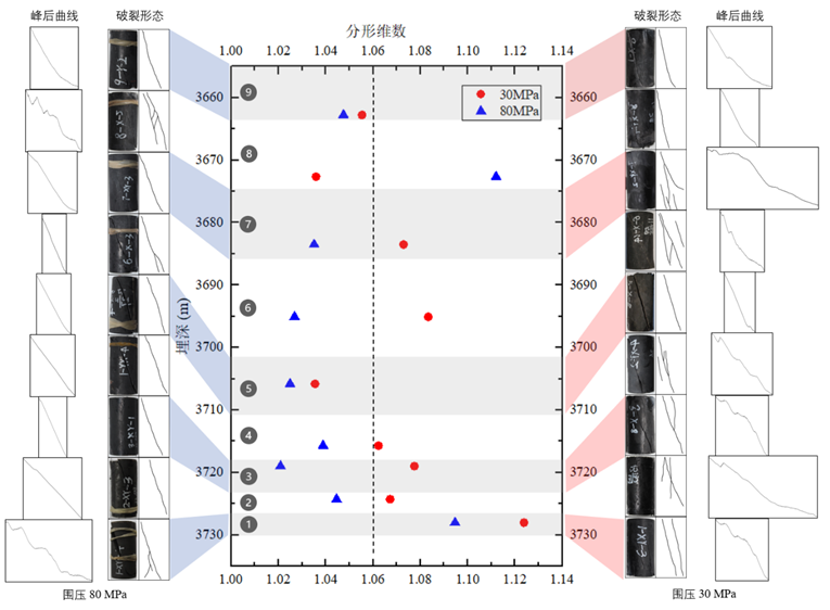 为此,依托十三五国家科技重大专项,中国科学院武汉岩土力学研究所油气中心团队科研人员与中国石化江汉油田合作,选取四川盆地某一深层页岩气先导试验井,针对整套上奥陶统五峰组-下志留统龙马溪组含气页岩储层(埋深约3700m,厚度约83m),采集了全部9套地质小层的代表性井下岩心,开展了高应力条件下(围压80MPa)的三轴压缩试验,系统研究了各小层页岩的强度及变形破坏特征,定量表征了全应力-应变曲线峰后段的复杂形态(图1),建立了能够有效描述围压效应的新型脆性评价指标。结果表明,页岩储层力学参数在纵向上具有较强的非均质性,随着围压(埋深)的增大,试样破裂复杂度减弱,脆性下降显著(图2),解释了当前深层页岩气产量普遍较低的原因,为深层页岩水平井钻井、压裂施工优化设计提供了重要参考。