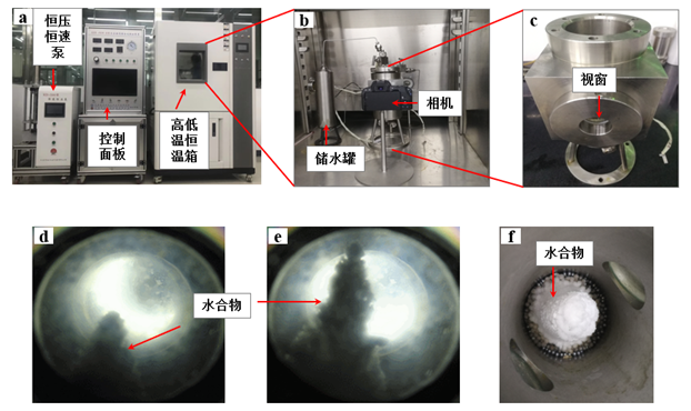 中国科学院武汉岩土力学研究所韦昌富研究团队围绕该问题研制了气体水合物喷射合成装置(图1),该装置通过在高压低温的环境中喷射水雾,气体在与水雾接触后会快速合成水合物粉末,如何控制水压和气压的大小,如何控制水雾的粗细才能使喷出的水雾合成水合物是该装置主要解决的问题,在喷射合成水合物的过程中,可通过反应釜上的视窗观察水合物合成的过程,水合物制备过程耗时短,效率高,随用随制,为制备纯水合物提供了便利。