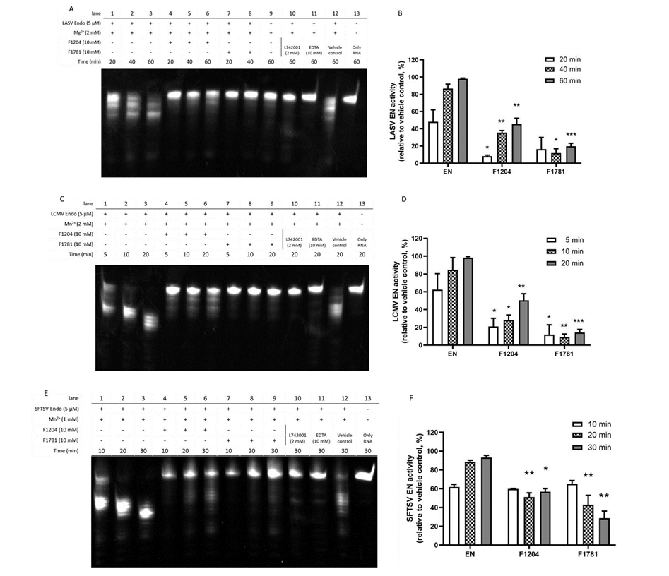 图1:F1204和F1781抑制LASV、LCMV及SFTSV核酸内切酶活性。