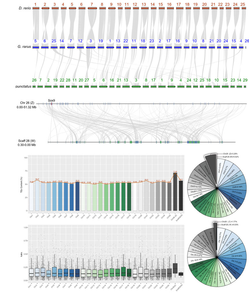 研究团队通过多组学数据联合分析,得到了高质量稀有鮈鲫基因组。通过对所有染色体的系统分析,鉴定出稀有鮈鲫性别决定方式为ZZ/ZW型,并对性染色体的结构、序列及性别决定基因等方面进行了比较分析。该研究揭示了稀有鮈鲫与其他常见鱼类相比,其独特免疫系统的遗传基础。