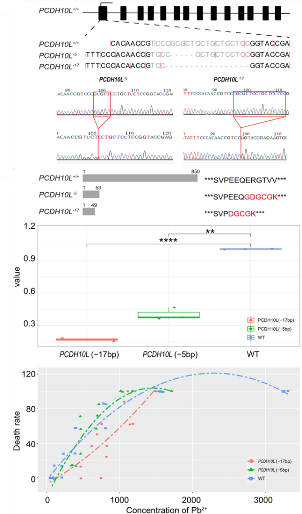 在此基础上,研究人员通过基因编辑技术敲除了鉴定到的关键基因,发现突变型相比于野生型对铅离子(Pb2+)的耐受性发生了显著变化。此外,通过攻毒实验发现了稀有鮈鲫比斑马鱼对草鱼出血病病毒敏感性更高的遗传基础。显示在草鱼出血病的防治研究以及重金属污染环境监测等方面,稀有鮈鲫是非常重要的模式生物。