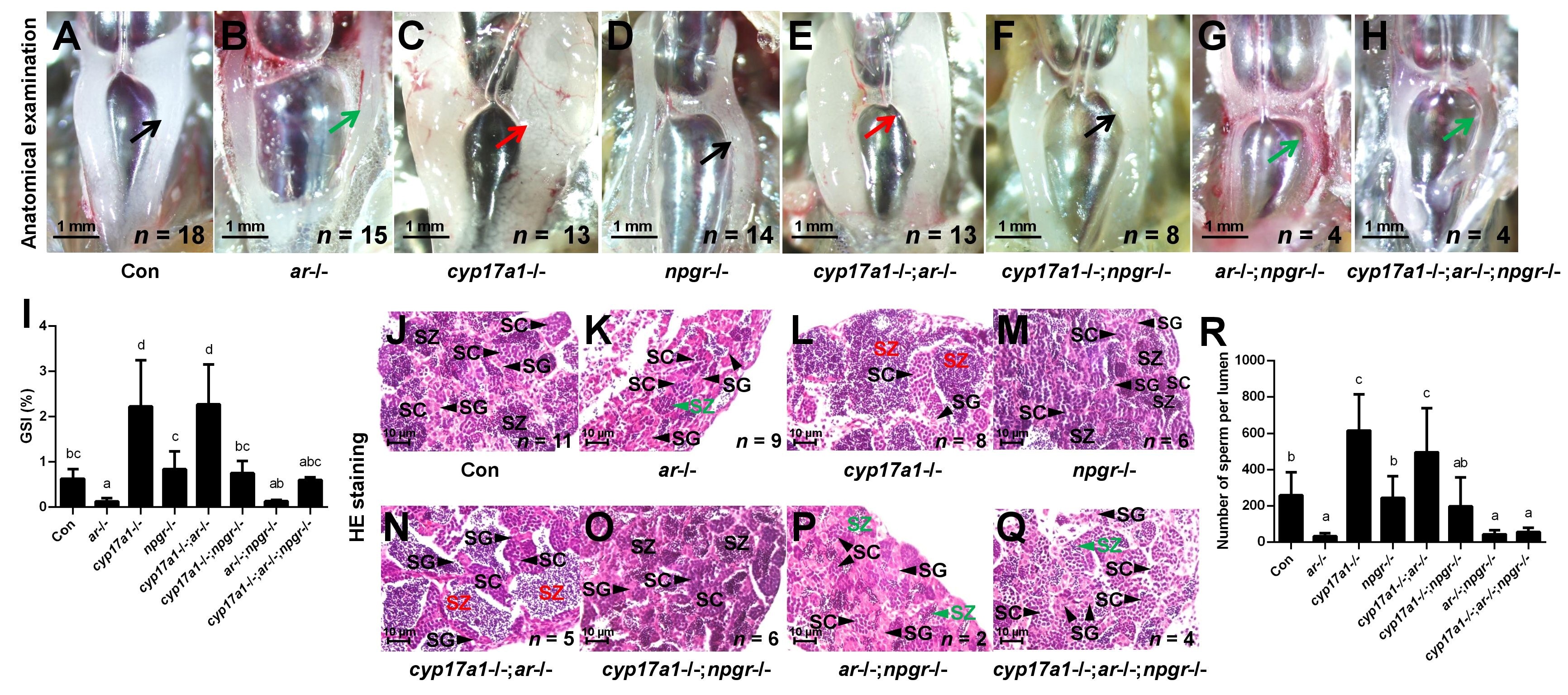 图1. 斑马鱼精巢组织在CYP17A1缺失背景下NPGR再敲除导致的解剖组织学观察