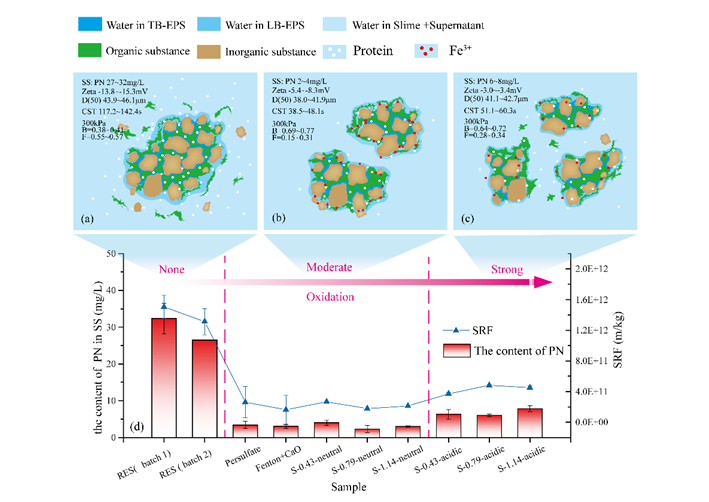 图1 适度的化学氧化提高了污泥的脱水性,与上清液中蛋白质的迁移和矿化有关
