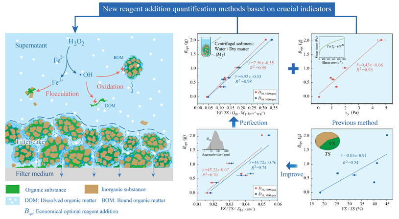 围绕陈化污泥难以高效深度脱水的工程难题,中国科学院武汉岩土力学研究所科研人员研究了陈化污泥物理化学特性,发现陈化污泥上清液加黏液中,可溶性有机物含量越少,相对腐质化程度越高,Zeta电位的绝对值越大,陈化污泥过滤性越高;揭示了氧化改性下有机质迁移矿化促进陈化污泥脱水固结作用机理,陈化污泥脱水性的改善是由于适度的氧化改性作用,当上清液加黏液层溶液中蛋白质的矿化量大于迁入量时,样品脱水性提高(图1);构建了基于陈化污泥关键特性的氧化试剂添加量估算模型,控制陈化污泥氧化改性的关键特性为有机质含量、聚合体粒径、可脱水程度和屈服应力(图2)。研究结果突破了现有陈化污泥氧化改性试剂适应性不强、添加量与处理效果不明确的现状,可为污泥堆填场陈化污泥的氧化改性-脱水固结工艺设计提供理论指导和技术支撑。