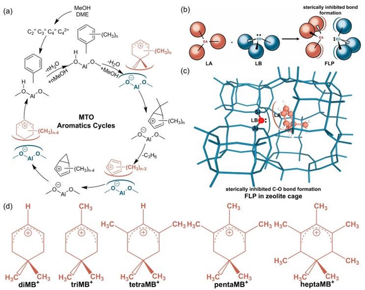 (a)碳正离子驱动的甲醇制烯烃的芳烃循环机制;(b)受阻的路易斯酸碱对结构;(c)分子筛笼中的碳正离子组成的路易斯酸碱对;(d)分子筛催化反应中常见的多甲苯碳正离子