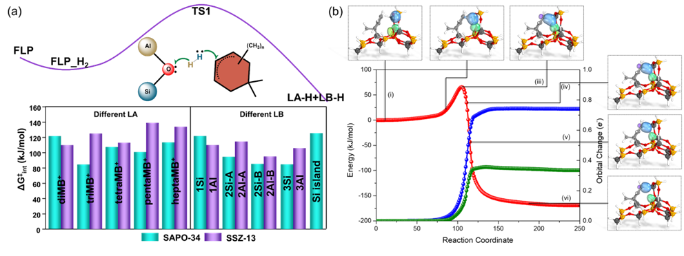 受阻的路易斯酸碱对(Frustrated Lewis Pairs, FLP)是均相催化反应中的重要概念,在FLP复合物中路易斯酸(LA)和路易斯碱(LB)的直接结合被位阻效应抑制,从而使得LA和LB能够分别作为电子对受体和给体活化小分子。近年来,这一概念逐渐被引入到多相催化体系以解释金属氧化物表面缺陷和掺杂位点的高催化反应活性。鉴于此,精密测量院郑安民研究团队和大连化学物理研究所研究员魏迎旭、博士韩晶峰合作,进一步将FLP概念拓展到分子筛催化体系,并探究了其对于氢气和烷烃活化的能力。
