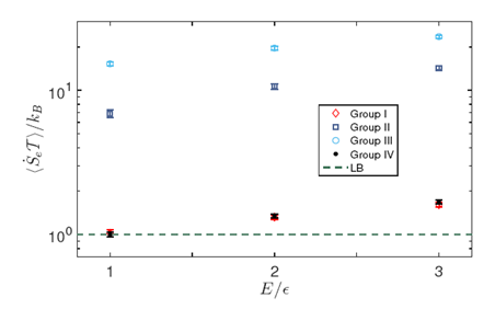 虚线为不确定性关系的下限,所有测量的四个通道的数据点(以四种颜色标记)都在虚线之上,表明耗散-时间不确定性关系成立