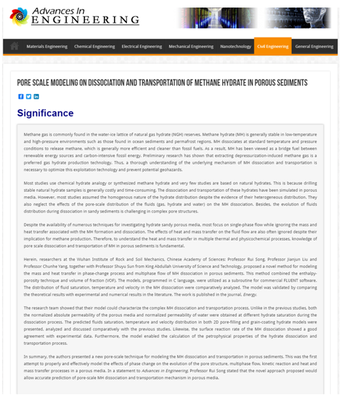 AIE报道链接:https://advanceseng.com/pore-scale-modeling-dissociation-transportation-methane-hydrate-porous-sediments/