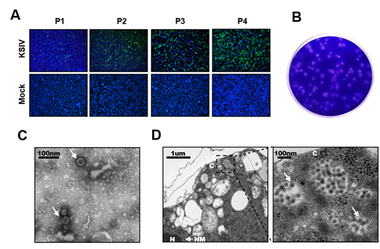 (A)免疫荧光检测KSIV在BHK-21细胞持续传代扩增;(B)噬斑实验鉴定KSIV感染力;(C)电镜观察KSIV颗粒形态;(D)电镜观察KSIV在感染BHK-21细胞中的定位