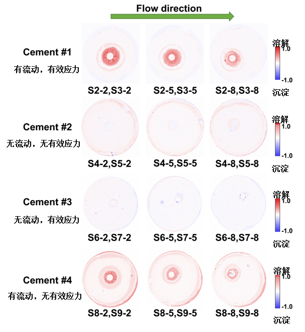 中国科学院武汉岩土力学研究所CO2地质封存课题组研究团队针对上述需求,搭建了高温—应力—渗流—腐蚀反应耦合试验系统,模拟了高浓度CO2盐水溶液在井筒水泥泄漏通道内腐蚀井筒水泥的过程,对流体流速和有效应力对水泥泄漏通道形态演变的影响进行了研究。团队利用压汞测试(MIP)获得了固井水泥样品腐蚀后的孔径分布,采用微米-CT表征手段,提出了CT切片特征分析算法,对腐蚀反应前后水泥样品的CT切片进行配准和对齐,成功获得了反应前后样品中泄漏通道形态的差异,实现了流体流速和有效应力对井筒水泥腐蚀过程影响的量化评价。研究结果表明,CO2注入条件下流速和有效应力对水泥中泄漏通道形态的演变有明显影响:流体流动会促进泄漏通道周围的氢氧化钙和水化硅酸钙的溶解,且靠近CO2注入端的位置溶解量更大;有效应力的存在会导致泄漏通道周围的裂纹明显增加,从而促进氢氧化钙和水化硅酸钙的溶解;在CO2注入阶段,因储层压力与地表压差较大,可能诱发CO2和咸水在井筒水泥泄漏通道中的高速流动,导致泄漏通道扩大。因此,在CO2注入阶段监测井筒水泥的完整性至关重要。