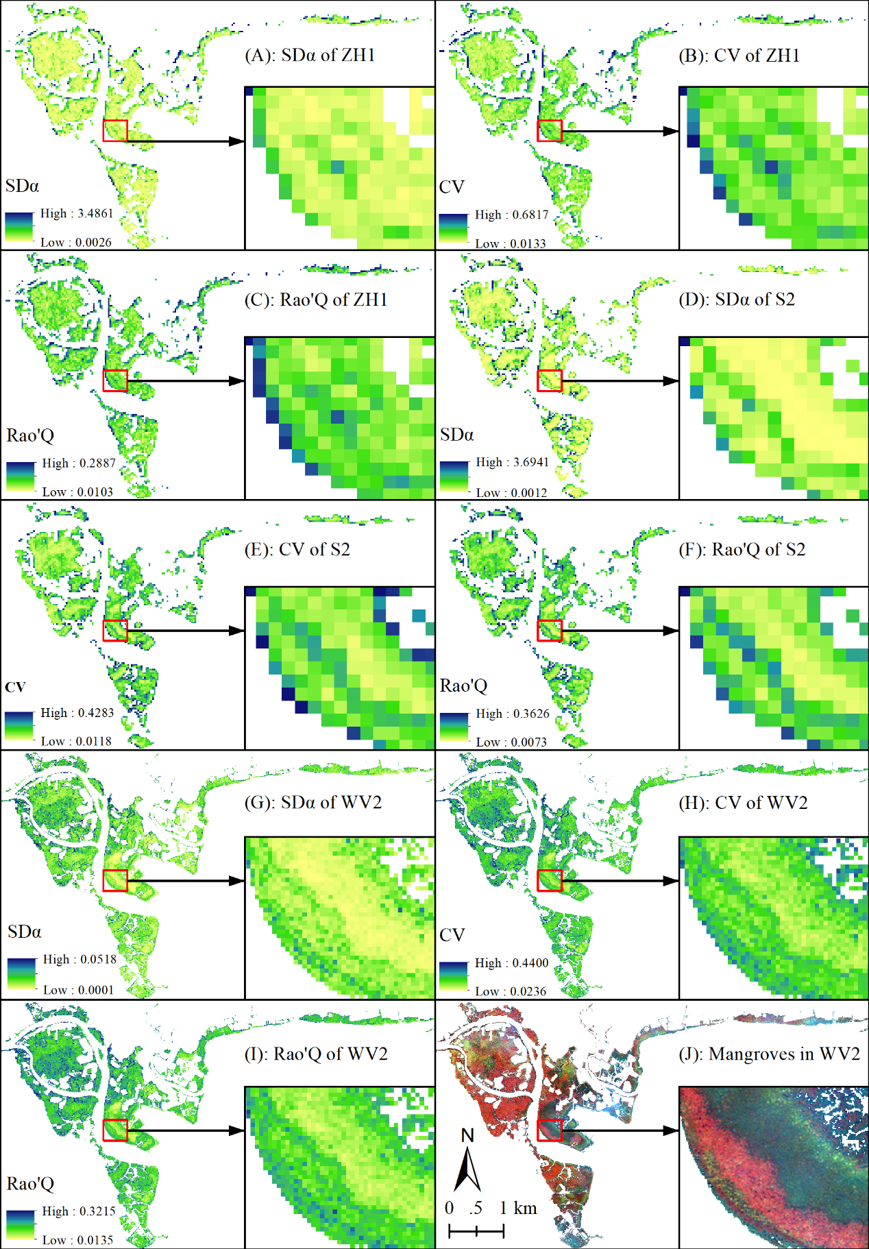 虽然从卫星和航空遥感角度评估植物生物多样性确实提供了一个新的视角,但现有的方法模型主要集中在单独估算α或β多样性(即群落内的多样性或群落间的多样性)。为此,该研究团队基于常用的遥感影像(WorldView-2, Sentinel-2,和Zhuhai-1)采用了一种全新的全局生物多样性方法来监测森林多样性,根据光谱变异假说,把γ多样性拆分为α和β多样性,并通过实地样方数据进行验证,最终得到准确的α和β多样性空间分布图。该研究发表于国际遥感领域顶级期刊Remote Sensing of Environment,题为“Mapping α- and β-diversity of mangrove forests with multispectral and hyperspectral images”。