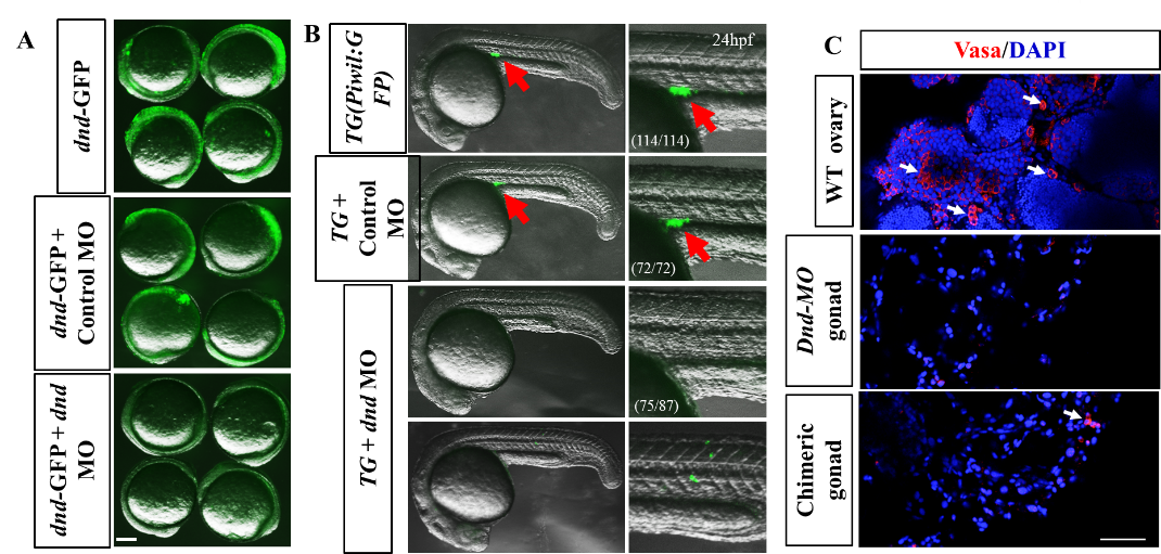 科研人员将分离培养出的fGSCs移植到去除原始生殖细胞的斑马鱼性腺中,3个月后发现黄鳝来源的Vasa阳性生殖细胞,提示移植的fGSCs已在斑马鱼性腺成功定植并分化,进一步说明黄鳝-斑马鱼嵌合体性腺的形成。