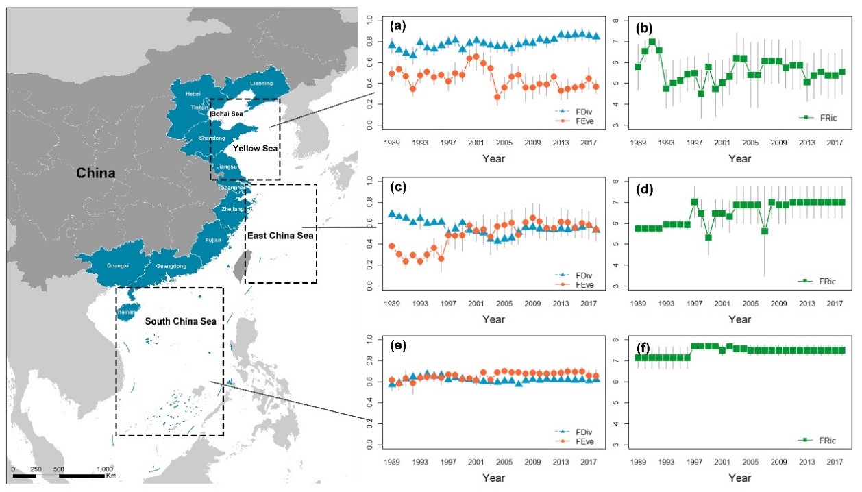 全球海洋生物多样性受到捕捞和气候变化的影响日益凸显,但仍不清楚这些驱动因素如何塑造海洋鱼类的功能多样性。中国科学院水生生物研究所生态化学计量学学科组组织研究团队对我国四大海区近30年的捕捞数据和气候变化数据进行了分析,阐明了我国海洋商业鱼类群落的功能多样性如何响应气候变化和捕捞压力,并在生态学经典期刊Global Ecology and Biogeography发表(https://onlinelibrary.wiley.com/doi/10.1111/geb.13534)。