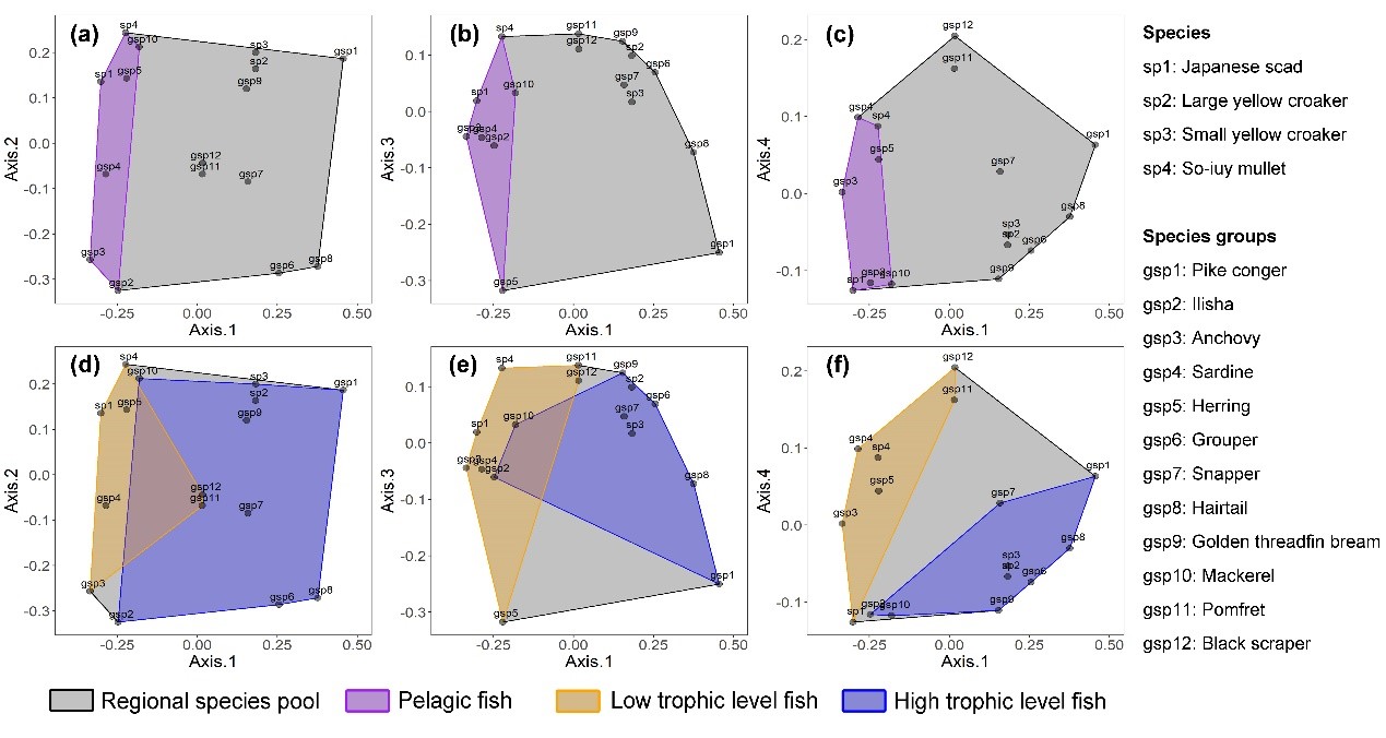 海洋鱼类群落四维性状空间中不同物种或物种群的分布