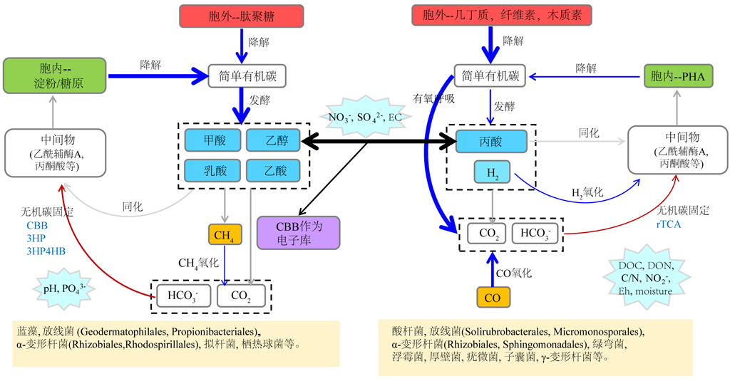 宏基因组的测序分析结果表明,耗能的光能驱动的无机碳(Inorganic Carbon, IC)固定基因丰度较低,经济的化能驱动的高分子有机碳降解、发酵、需氧呼吸和CO氧化基因较丰富。在有机碳的分解过程中,初期淀粉/糖原和纤维素的降解相关基因丰度更高,末期发酵相关基因的丰度更高。结合绝对定量的GeoChip分析及关键酶活性测定,发现在演替过程中无机碳固定、发酵、CH4氧化、淀粉/糖原和肽聚糖降解过程均呈下降趋势,多个高效的IC固定途径及CO氧化和大多类型的有机碳降解呈增加趋势。共现分析进一步表明,生物结皮生态系统中的碳循环由类似于初级生产的同化模块和类似于次级生产的异化模块组成;随演替,循环途径与微生物群落组成之间的关系发生着动态变化,两个模块通过CBB循环、乙醇和丙酸发酵连接在一起,并被干旱度和盐度平衡。以上研究结果深化了对生物结皮演替过程中碳循环途径和调控机制的理解,并为深入揭示气候变化条件下全球干旱区碳库平衡动态提供了研究基础。