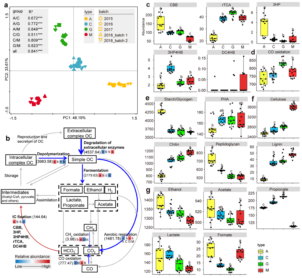 图2. 基于宏基因组测序的生物结皮的碳循环;(a)PCA和PERMANOVA结果;(b)碳循环基因和途径的相对丰度;右侧分别为各无机碳固定(c)、CO氧化(d)、胞内复杂有机碳的降解(e)、胞外复杂有机碳降解(f)以及各发酵(g)途径的相对丰度;A、C、G、M分别代表处于不同演替阶段的四类生物结皮