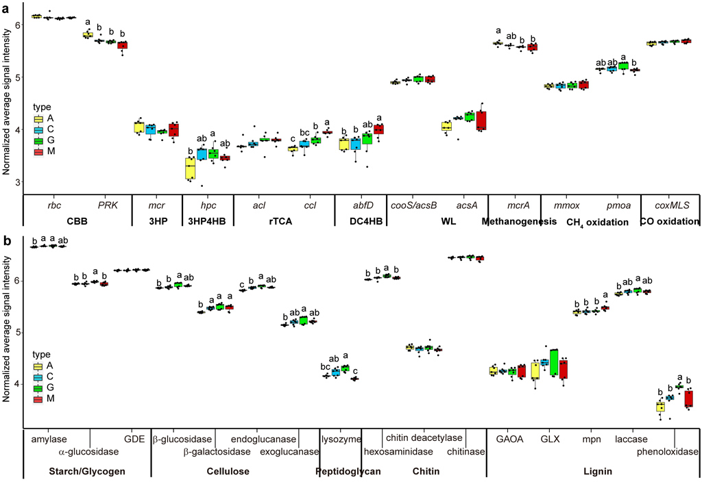 图3. 基于GeoChip分析的关键基因或酶标准化平均信号强度;(a)无机碳固定、甲烷代谢以及CO氧化过程;(b)有机碳降解过程