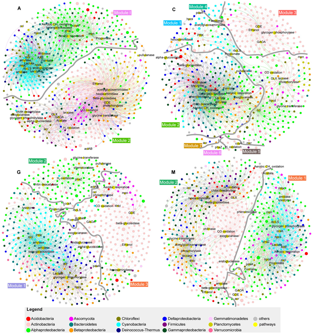 图4. 碳循环关键基因与属水平高丰度微生物的共现性网络
