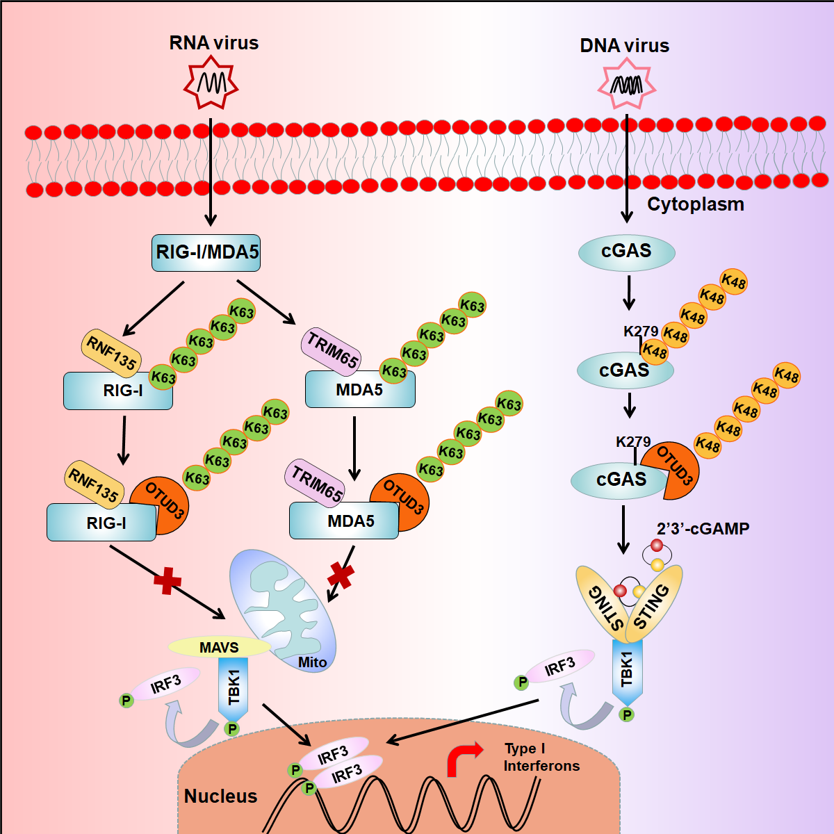 在模式识别受体中,Toll样受体3(TLR3)主要识别细胞外和细胞内的病毒RNA,而细胞质病毒RNA主要由RIG-I样受体识别,细胞质病毒DNA则主要由cGAS/STING识别。RIG-I样受体包括RIG-I和MDA5,当其与病毒RNA结合后发生构象变化,并招募PP1α/γ进行去磷酸化,进而由多个E3泛素连接酶,如TRIM25、TRIM65、RNF135等,介导其发生K63位连接的多聚泛素化,激活先天免疫信号通路。cGAS是一个环磷酸鸟苷-腺苷合成酶,当cGAS与病毒DNA结合后,介导合成第二信使cGAMP。cGAMP再与内质网(ER)上的膜蛋白干扰素基因刺激因子(STING)结合,并活化STING,激活先天免疫信号通路。cGAS的活性同样也受到蛋白修饰的调节。