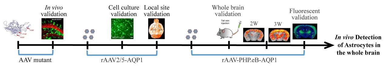 自2016年起,研究团队在精密测量院研究员徐富强和王杰的带领下,联合磁共振成像与病毒基因改造技术率先提出一种新型基因编码生物磁共振成像技术,逐步实现神经元网络(Neuroimage, 2019; Human Brain Mapping, 2021)和星形胶质细胞(Molecular Psychiatry, 2022)在体水平的无创检测。其中,rAAV是近年来发展极为迅速的一类工具病毒,是研究神经科学相关问题和基因治疗的重要载体。团队首先对rAAV工具病毒的衣壳蛋白进行突变改造,并利用人类胶质纤维蛋白的启动子GFAP构建rAAV载体,提升了病毒工具在星形胶质细胞的转导效率(图2)。