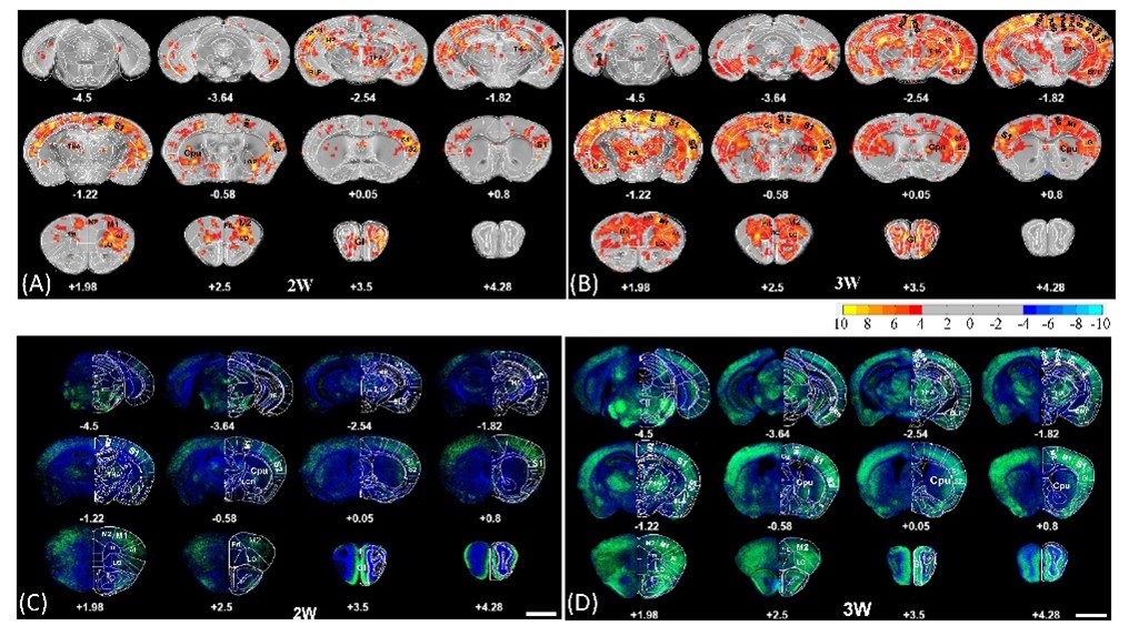 另外,水通道蛋白(Aquaporin, AQP)是一组高度保守的跨膜转运蛋白,对水具有高度选择通透性。过表达AQP1蛋白可产生弥散加权成像(Diffusion-weighted imaging,DWI)信号的改变,因而水通道蛋白基因可作为磁共振成像报告基因。团队继续对病毒载体rAAV2/5和rAAV2/PHP.eB进行优化改造,使其同时携带水通道蛋白报告基因和荧光元件,构建新型工具病毒,逐步实现脑区和全脑水平的星形胶质细胞的无创活体成像。在全脑成像研究中,团队构建可高效通过血脑屏障的新型rAAV2/PHP.eB-AQP1-EGFP工具病毒,利用尾静脉注射技术将该病毒注入小鼠体内,在病毒表达两周和三周后分别进行MRI活体成像,最终利用荧光成像对活体成像效果进行评估(图3)。结果显示,该新型基因编码生物磁共振成像技术不仅可实现星形胶质细胞的活体全脑成像,而且其成像时间适用于常用的光遗传学/药理遗传学相关研究。