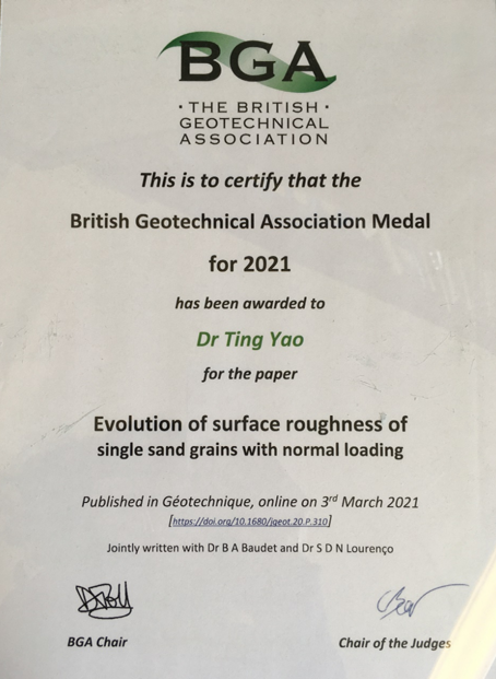 该奖章设立于1958年,每年基于在国际权威期刊、英国岩土工程学会(BGA)、国际土力学与岩土工程学会(ISSMG)和国际岩石力学学会(ISRM)会议上发表的论文,遴选出本年度“对岩土科学或实践做出杰出贡献”的学者(每年仅一人)。获得“BGA Medal”意味着该学者的研究成果在岩土工程领域具有世界级影响力,对岩土科学的发展做出了杰出贡献。