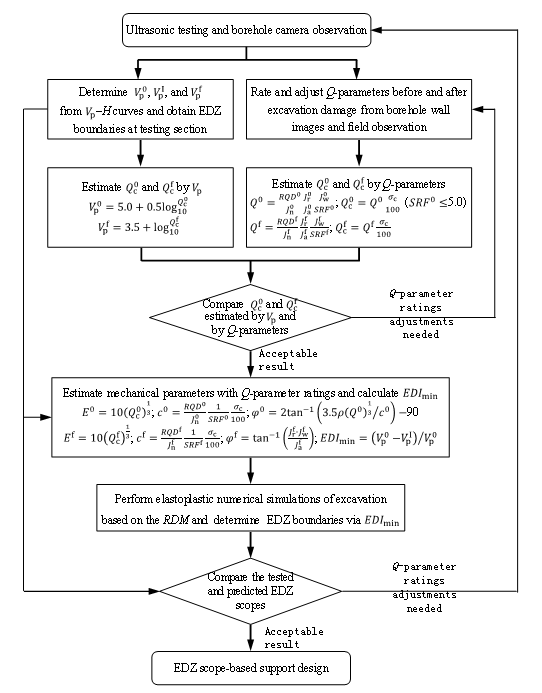 为此,在国家自然科学重点基金和面上基金支持下,中国科学院武汉岩土力学研究所智能岩石力学组科研人员基于锦屏地下实验室II期工程的声波测试和钻孔摄像原位测试结果,提出了一种用于估计深部洞室脆性岩体开挖损伤区的综合预测方法(图1)。这一方法是根据钻孔尺度(图2中的第一阶段)上的岩体节理分布和Vp–H曲线来估计洞穴/隧道尺度上的(图2中的第二阶段)围岩劣化模型(RDM)的主要输入参数,并利用基于RDM模型和弹模劣化指标(EDI)的弹塑性数值模拟,从实测的二维EDZ范围外推出完整的三维EDZ空间分布。