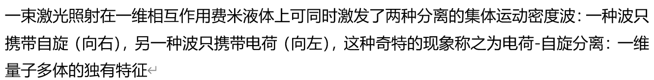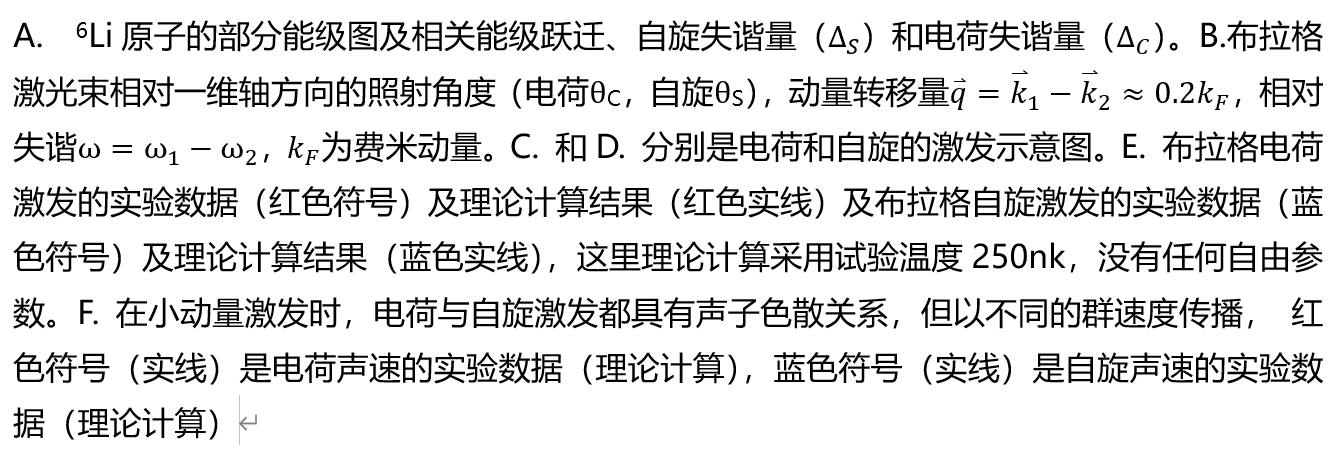 中美研究团队自2018年开始合作,通过研究一维相互作用费米气体杨-高丁模型(Yang-Gaudin model)的精确解,发现在长波极限下该模型中的电荷自由度的粒子-空穴集体激发和自旋自由度的分数化准粒子(自旋子)激发可完美地形成分离的自旋密度波和电荷密度波,这样通过布拉格谱可以分别测得自旋和电荷的动力学结构因子(dynamics structure factor(DSF)),该物理量深刻揭示了量子液体中多体关联的本质。因此,通过对相关集体激发谱的DSF的测量可以实现对自旋-电荷分离现象的确定性验证,他们的这一理论预言在2020年率先发表在《物理评论快报》上(Physical Review Letters 125,190401 (2020))。