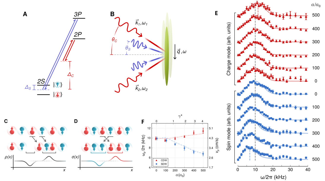 2020年至今,研究团队进一步合作通过囚禁一维超冷原子实验成功地验证了这一重要的量子多体物理的普适规律。在囚禁的一维超冷6Li费米原子中,他们对电荷DSF的测量选择了精细能级|1> and |2> (|F = 1, MF = ±1/2)作为自旋态,2P3/2态为激发态,对自旋DSF的测量选择了精细能级|1> and |3> 作为自旋态,3P3/2态为激发态,参见图一(A-D)。他们通过布拉格光分别激发电荷与自旋密度波,并调控不同相互作用强度测量出其相应的电荷和自旋的布拉格谱,参见图一(E)。在不同相互作用下布拉格谱的峰值给出了相应的电荷和自旋的传播声速,参见图二(F)。在理论方面,他们通过复杂的三维粒子数分布获得了一维管状系统中的密度分布,再进一步利用一维相互作用费米气体杨-高丁模型精确解和朝永-拉亭戈液体理论精确计算了囚禁冷原子电荷与自旋的DSF。考虑了电荷激发谱中的曲率修正和自旋激发谱中的反向散射引起的非线性效应后,理论与实验结果非常吻合。这在国际上首次通过超冷原子实验验证了自旋-电荷分离现象的朝永-拉亭戈液体理论,并给出非线性拉亭戈液体理论的有力证据。本项工作不但展现了量子多体物理中的典范,并且为将来基于原子分子和光物理的精密测量科技提供了新的思想。