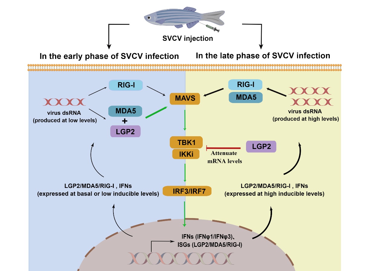 鱼类也有3个保守的RLR受体。鱼类研究同样出现了LGP2或发挥正调控、或发挥负调控的矛盾结果。针对这种认知混淆的现状,中国科学院水生生物研究所张义兵研究团队在2018年提供体外证据:斑马鱼LGP2在病毒感染的早期能激活细胞的干扰素抗病毒免疫反应,发挥正调控功能;在病毒感染的晚期,则抑制细胞的抗病毒免疫反应,发挥负调控功能(J Immunol 2018; 200:688-703)。最近,团队又提供了体内证据:通过比较野生型和敲除LGP2基因的斑马鱼在感染病毒后的免疫反应,证明斑马鱼在缺失LGP2后死亡率显著增加。机制是:缺失LGP2严重破坏了鱼体在应对病毒感染时的免疫稳态。这种严重破坏,导致在病毒感染的早期,鱼体的干扰素抗病毒免疫反应不能尽快启动到有效清除病毒感染的适度水平,而在病毒感染的晚期,又不能使鱼体的抗病毒免疫反应及时回归到正常的本底水平;团队同时揭示了LGP2发生功能转换的分子机制(图1)。研究论文近期在IScience发表(IScience,2022, 25:104821)。
