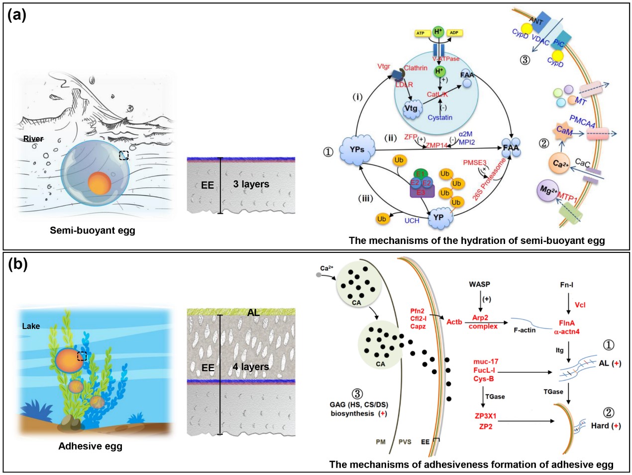 图1 鲤科鱼类东亚特有类群适应性辐射下两种产卵习性的分子机制总结示意图。(a)漂流性卵的水合作用机制;(b)粘性卵的粘性形成机制。