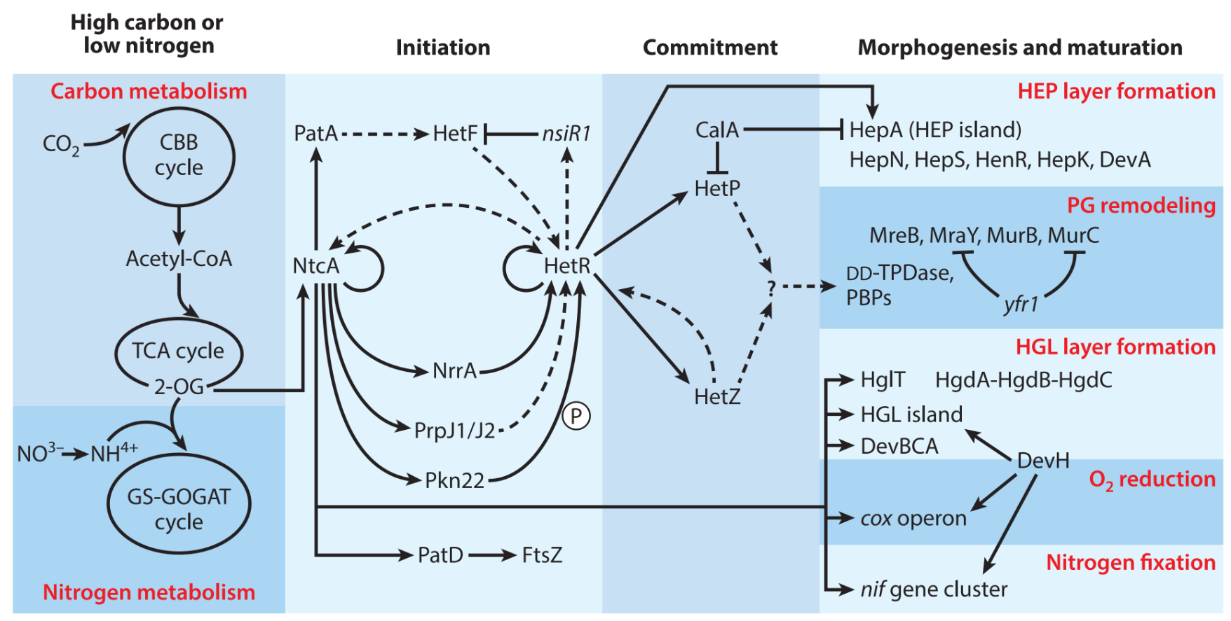 异形胞发育的过程主要包括信号感知(高碳或低氮信号)、异形胞发育起始(Initiation)、命运决定(Commitment)、形态发生及成熟(Morphogenesis and maturation)四步,各步骤由众多基因共同协调控制。作者在文中首先系统论述了异形胞发育各步骤调控分子机制研究进展,并绘制了详细的异形胞分化调控网络模型(图2)。
