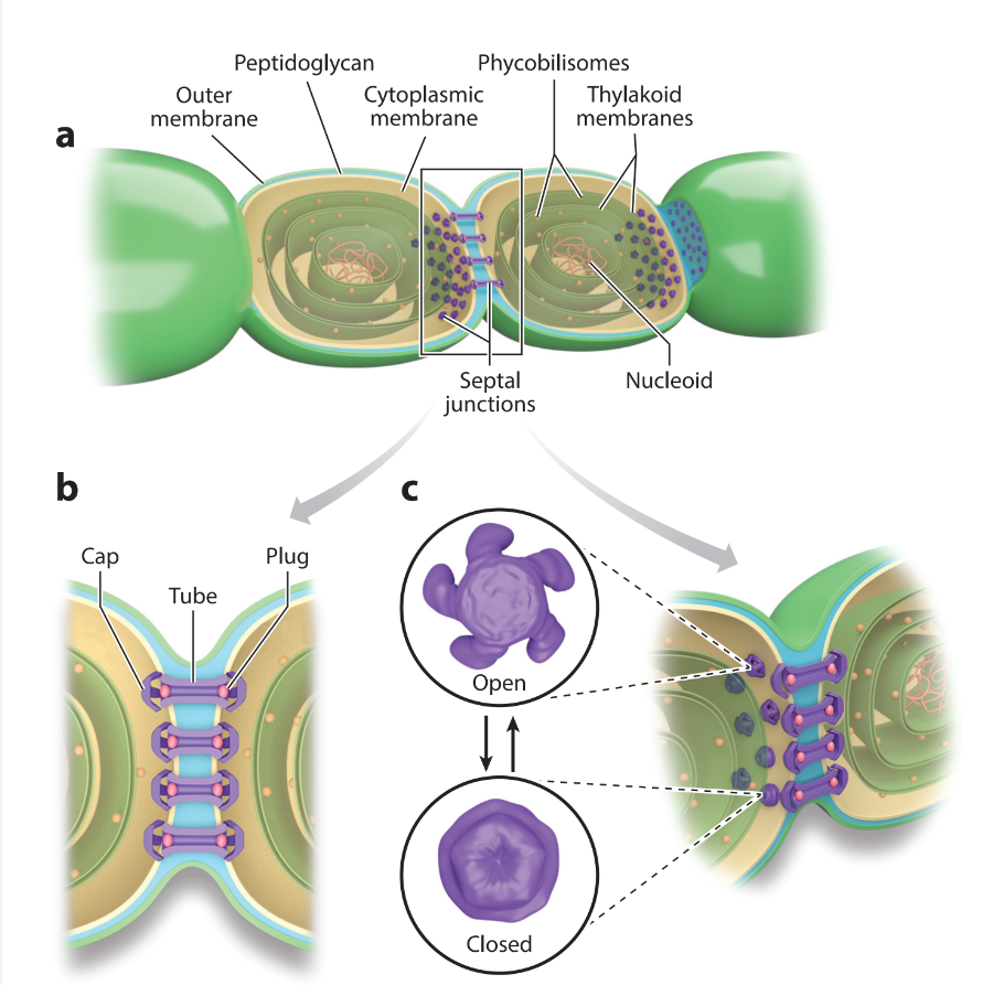 其次,在分化过程中,异形胞发育与菌丝生长的协调依赖于细胞-细胞间的通讯(cell-cell communication)。作者以研究细胞-细胞间通讯技术手段的发展进程为时间线,密切追踪丝状蓝细菌细胞间通讯研究前沿,并系统性的阐述了其研究进展。研究表明,丝状蓝细菌主要通过贯通细胞-细胞间隔膜的通道结构(septal junctions)进行细胞间的“信息交流”,该结构与后生动物的间隙连接结构类似(图2),它通过动态结构变化快速控制细胞间通讯以响应环境条件的变化。
