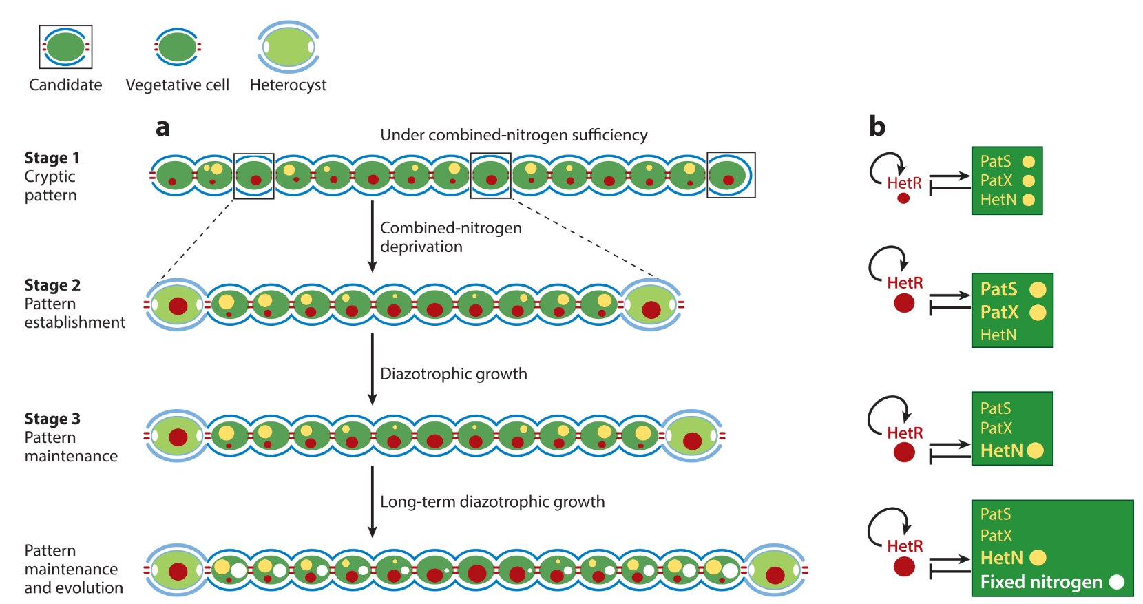 蓝细菌(又称蓝藻)是最早的光合原核生物,其出现是地球上最伟大的事件之一。很多蓝藻同时也具备固氮能力,是自然界氮循环的主要参与者。固氮由固氮酶催化完成,固氮酶对氧气极端敏感,遇氧失活。丝状蓝藻进化出空间分离机制,调和了有氧光合作用和固氮这两个不相容的过程,即在营养细胞中进行光合作用,在分化出的异形胞中进行固氮。
